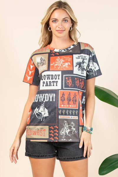 AV1205-IVY WESTERN RODEO PRINT SHORT SLEEVE T-SHIRT : Charcoal/Rust / Contemporary / S