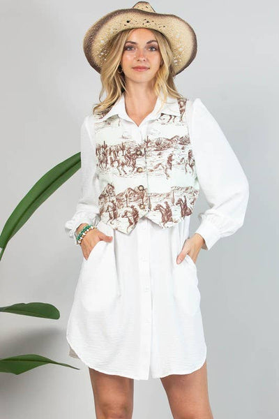Experience the charm of the Wild West with Avery's Gabby Western Print Button Down Woven Vest. This unique dress merges style and comfort, offering a chic addition to your wardrobe. Inspired by the vibrant colors and patterns of the west, this woven vest showcases Avery's commitment to creating clothing that uplifts the soul and boosts confidence. This vest is more than just a piece of clothing - it's a best friend that's always there to create memorable moments with you.